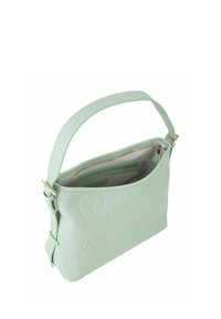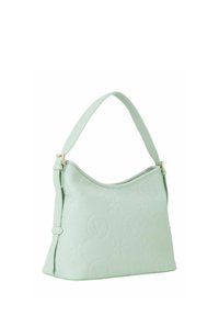 Sac à main en similicuir vert menthe avec une forme incurvée, des motifs floraux embossés et un logo, ainsi qu'une bandoulière unique réglable.
