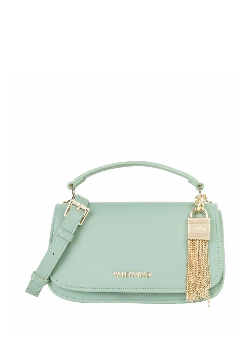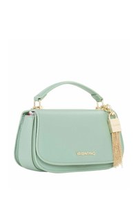 Sac à main en similicuir vert menthe avec une poignée supérieure et une sangle réglable. Comprend des éléments en métal doré, des détails de logo et un pendentif à franges.