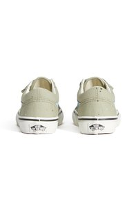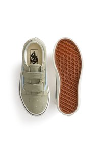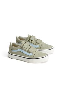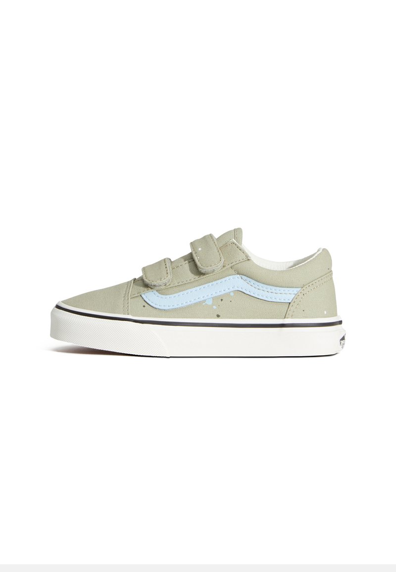 Baskets en toile verte avec fermetures à scratch, bande latérale bleu clair, intérieur blanc et bordure de semelle extérieure noire.