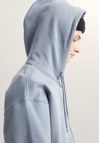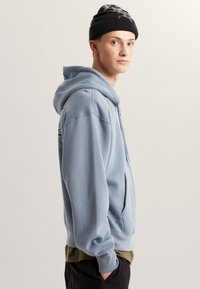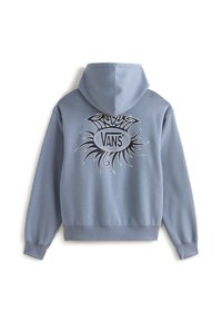 Hoodie bleu clair avec capuche, présentant un motif de soleil et le logo "VANS" dans le dos. Porté par-dessus une chemise vert olive et un pantalon noir.