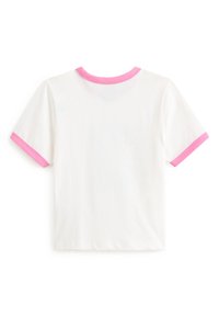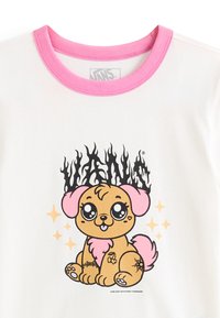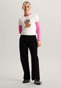 Jeune femme aux longs cheveux blonds portant un chemisier à manches longues superposé blanc et rose avec un dessin de chien de dessin animé entouré de flammes et d'étincelles sur le devant.