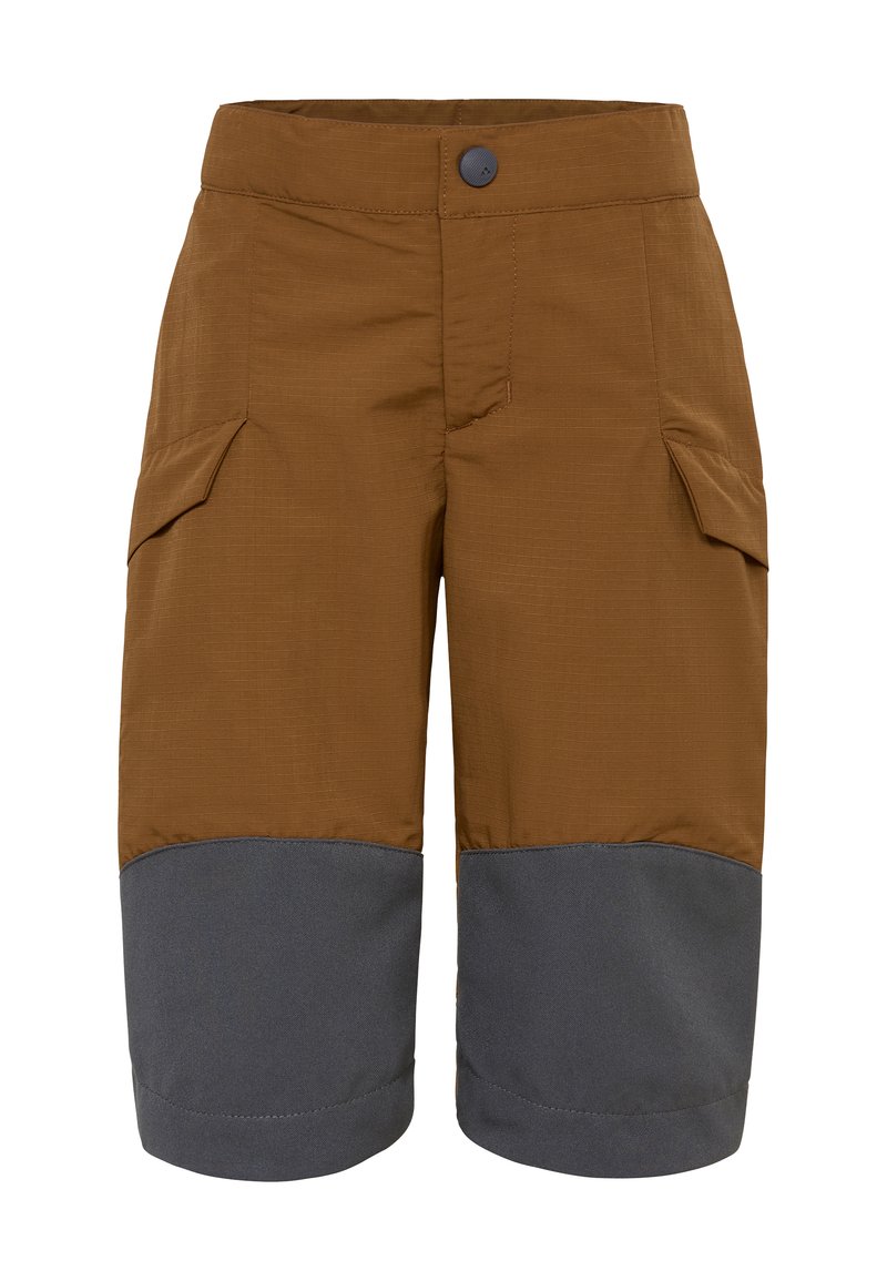 Shorts marron avec jambes inférieures renforcées gris foncé, fermeture avant à boutons, et poches à rabat latérales, adaptés aux activités de plein air.