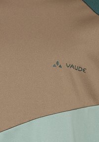T-shirt de sport à manches longues avec col rond, color-block en brun, vert foncé et vert clair, arborant un petit logo "VAUDE" sur la poitrine.