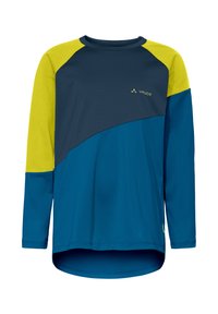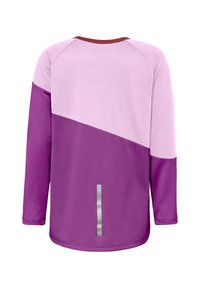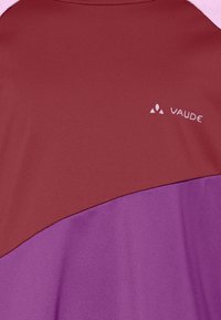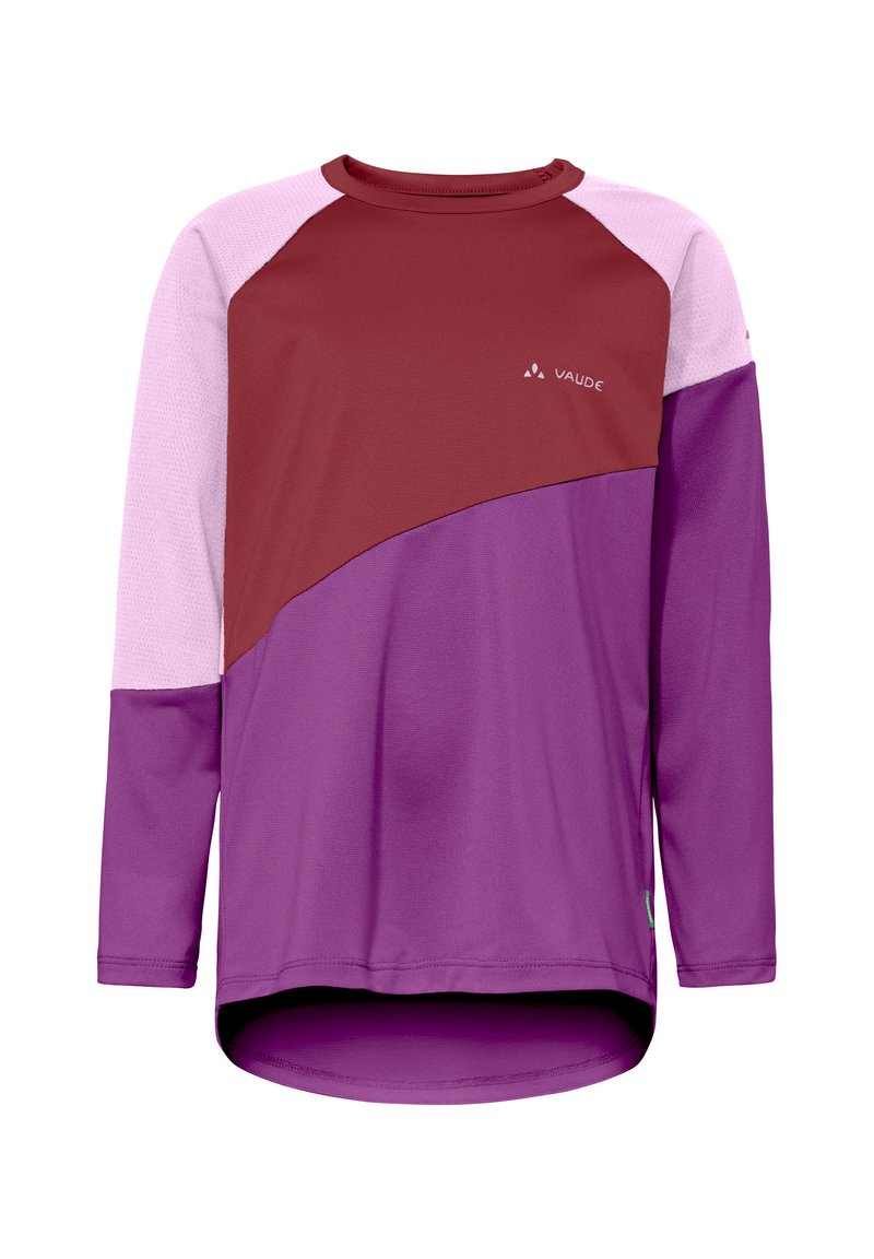 T-shirt de sport à manches longues avec blocs de couleurs en bordeaux, rose clair et violet, arborant un petit logo "Vaude" sur la poitrine.