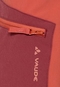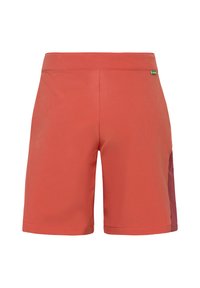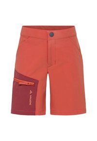 Shorts de sport rouges avec une poche zippée rouge foncé sur la cuisse gauche et une fermeture à bouton à la taille.
