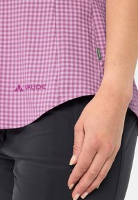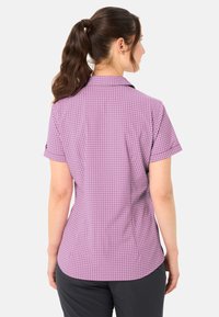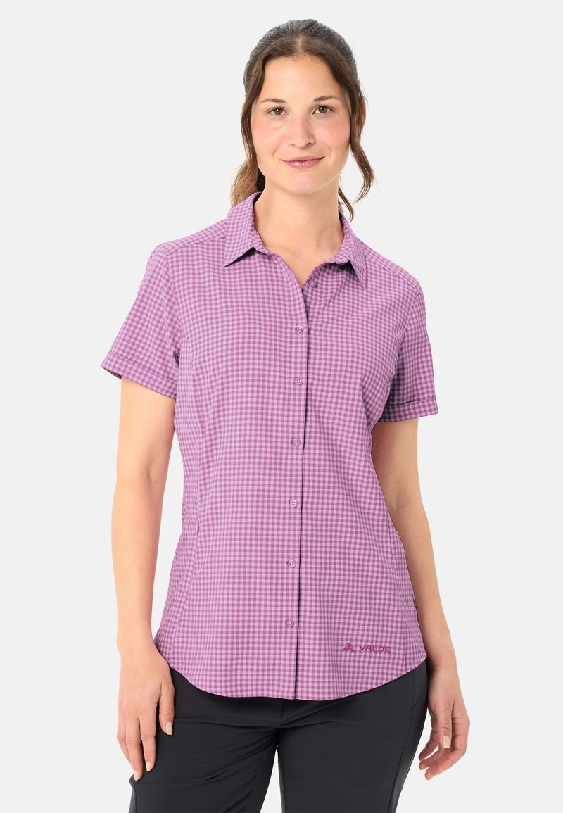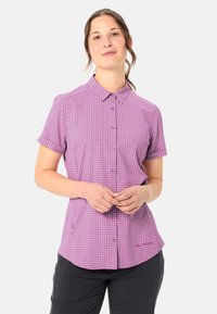Femme debout, portant une chemise à manches courtes à carreaux violets avec des boutons et un pantalon noir, sur un fond blanc uni.