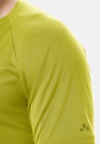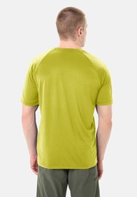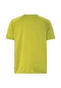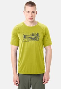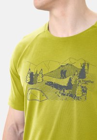 Homme portant un t-shirt vert citron avec un graphisme de montagne, d'arbres, de randonneurs et de tente, associé à un pantalon vert olive, debout devant un fond blanc.