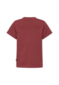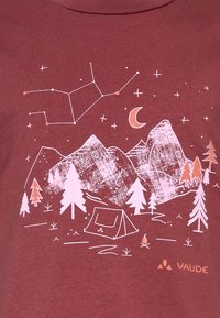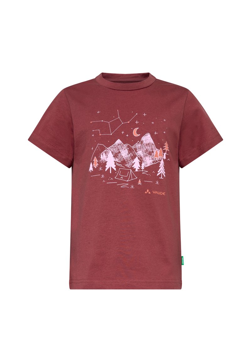 T-shirt bordeaux à manches courtes avec un imprimé blanc représentant une scène de camping comprenant des montagnes, des arbres, une tente, un feu de camp, la lune et des constellations d'étoiles.