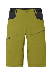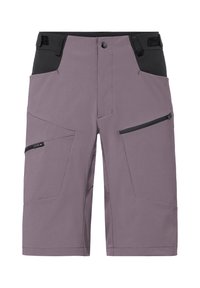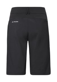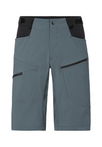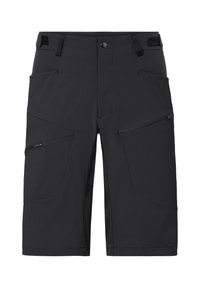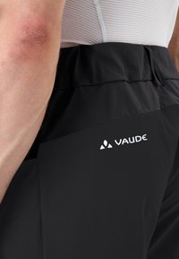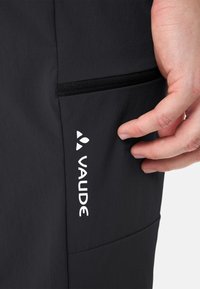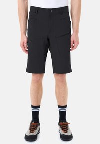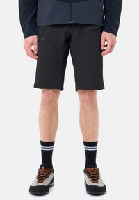 Homme portant un short noir mi-cuisse avec des poches latérales zippées, des chaussettes noires à deux bandes blanches et des chaussures de randonnée grises avec des lacets orange.