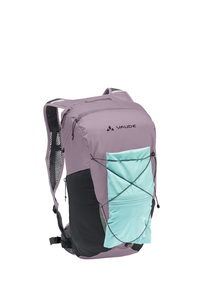 Sac à dos Vaude compact violet et turquoise avec poches latérales en mesh noir, compartiments zippés et bretelles réglables.