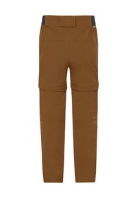 Pantalon d'extérieur convertible marron avec jambes amovibles par fermeture éclair, bouton et fermeture éclair à l'avant, passants pour ceinture et poches latérales zippées.