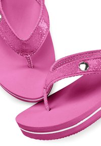 Des tongs roses flashy avec des accents scintillants, sur fond de plage. La personne porte un débardeur blanc et un short en jean, tenant les chaussures.
