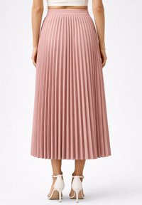 Femme portant une jupe midi plissée taille haute rose poudré avec des talons blancs à bride cheville, debout avec une main sur la hanche.