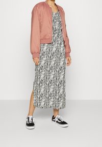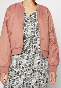 Veste bomber rose en tissu léger, avec des poignets côtelés et une poche zippée, associée à une robe à motif noir et blanc.
