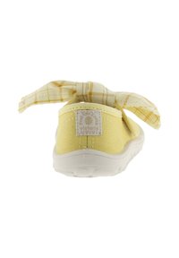 Chaussure en toile jaune avec semelle en caoutchouc blanc, bout rond et un nœud à carreaux en accent. Présente un design à coupe basse et une semelle extérieure flexible pour le confort.