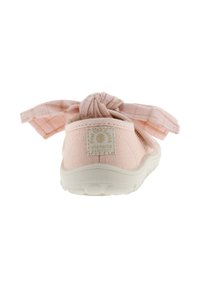 Chaussure en tissu rose avec une tige en toile texturée, dotée d'un détail nœud à l'avant et d'une semelle extérieure en caoutchouc blanc flexible.