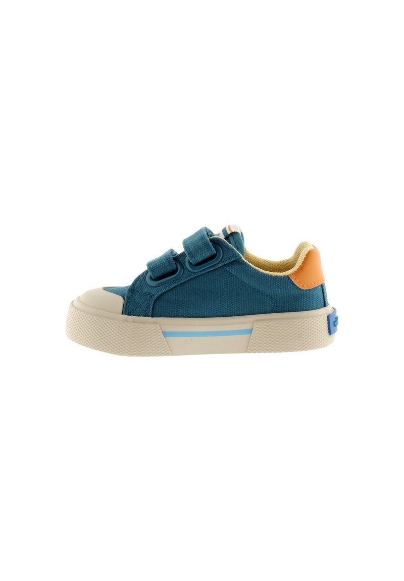 Baskets en toile bleu pour enfant avec semelle en caoutchouc beige, deux brides Velcro, un patch talon beige et une bande bleu clair sur la semelle.