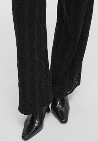 Pantalons larges noirs en tissu texturé avec un motif ondulé. Ils sont dotés d'une taille haute et d'une longueur légèrement raccourcie.