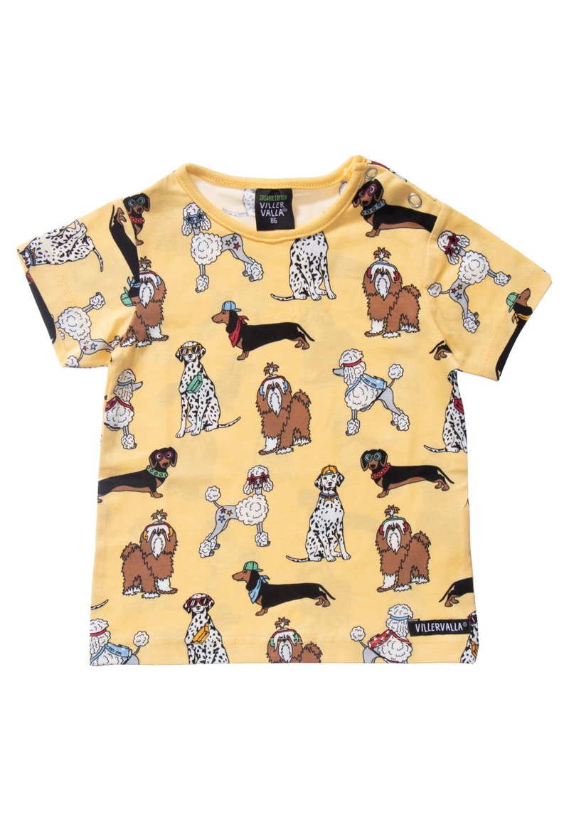 Chemise jaune à manches courtes pour tout-petit avec des illustrations colorées de chiens portant des chapeaux et des accessoires, étiquetée "VILLERVALLA" sur l'ourlet inférieur droit.