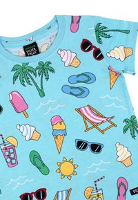 Chemise enfant bleu clair avec des icônes d'été colorées comprenant palmiers, lunettes de soleil, glace, tongs, boissons et chaises de plage.