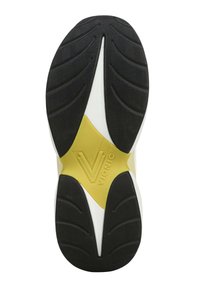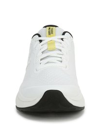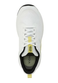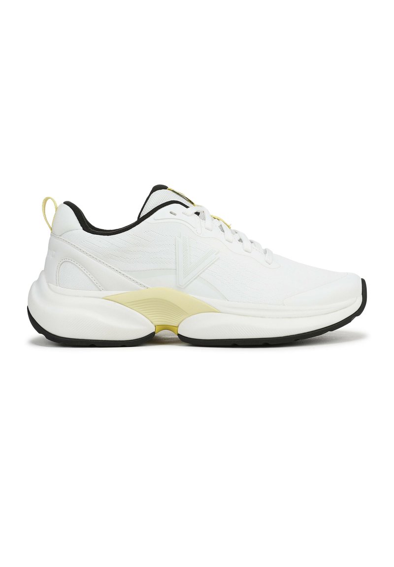 Chaussures de sport blanches avec une tige texturée, des accents jaunes sur les côtés et une semelle extérieure noire. Caractéristiques : col rembourré et lacets.