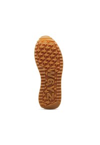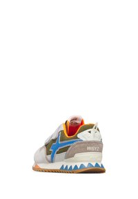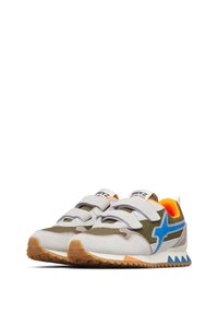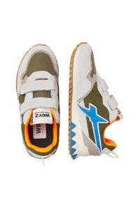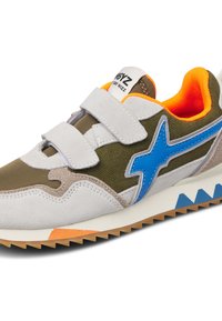 Baskets basses avec panneaux vert olive, beige et blanc, logo latéral bleu, doublure orange, deux sangles à velcro et semelle à motif zigzag.