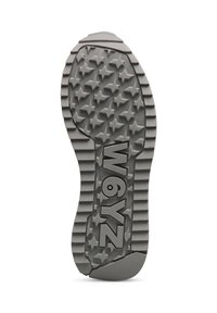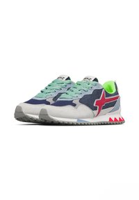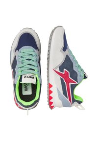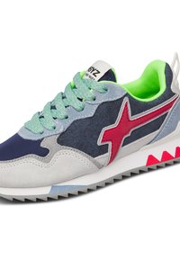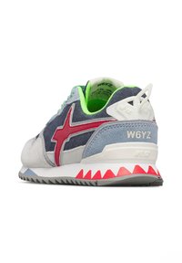 Baskets sportives avec daim gris, mesh bleu marine, logo latéral rouge, lacets verts, doublure vert néon, et semelle à motif zigzag en blanc et rouge.