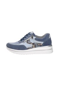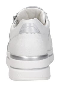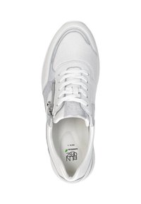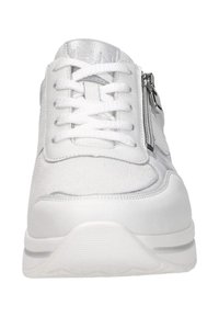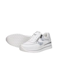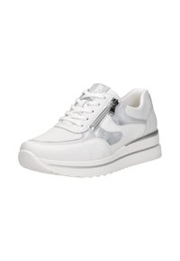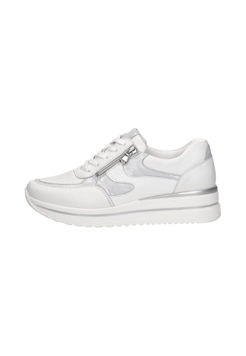 Baskets basses blanches avec des accents argentés, lacets à l'avant, fermeture éclair latérale et semelle épaisse, affichées de profil extérieur sur fond blanc.