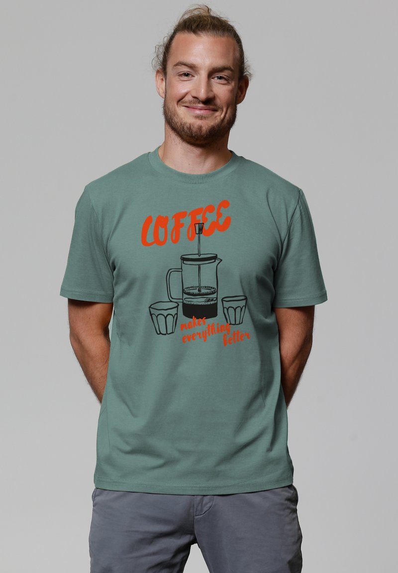 T-shirt en coton vert avec le texte rouge "LE CAFÉ rend tout meilleur" et une illustration d'une cafetière et de deux tasses. Coupe décontractée.
