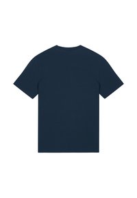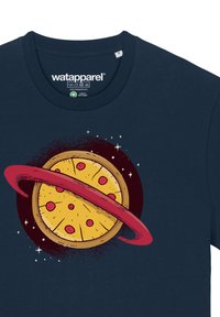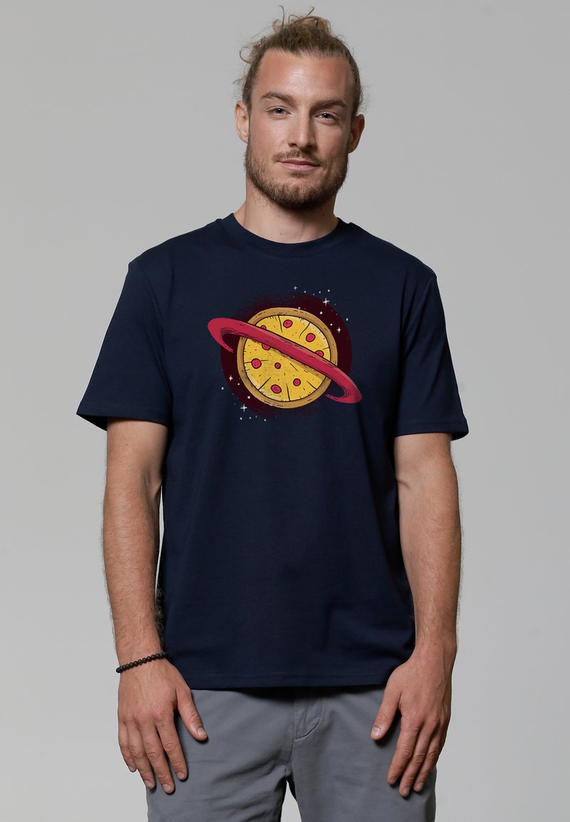 T-shirt en coton bleu marine avec un graphique d'une planète pizza entourée de points ressemblant à des étoiles, sur un fond neutre.