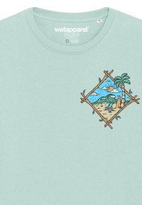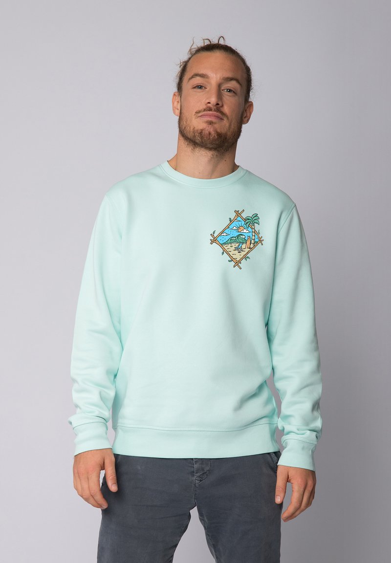 Sweatshirt vert menthe clair avec col rond, poignets côtelés, et une illustration en forme de diamant représentant des palmiers et des vagues sur la poitrine.