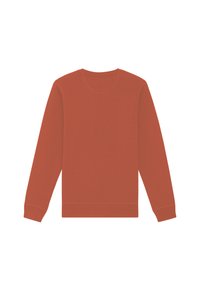 Sweatshirt de couleur rouille avec un col ras du cou ; présente un graphisme d'un personnage de dessin animé faisant du vélo. Fabriqué en tissu doux avec une texture lisse.