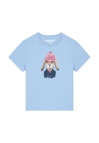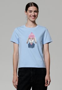 T-shirt en coton bleu clair avec une illustration de lapin portant un bonnet rose et des lunettes, sur un fond simple. Manches courtes, col rond.