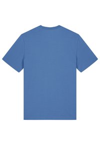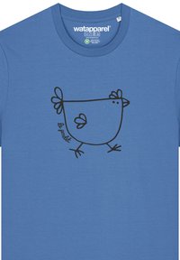 T-shirt en coton bleu à manches courtes avec un graphique à contour noir d'un poulet sur le devant, accompagné du texte "le produit."