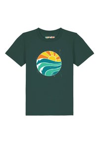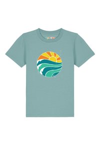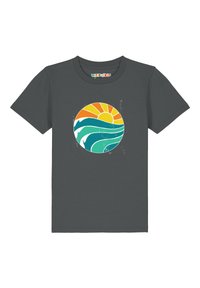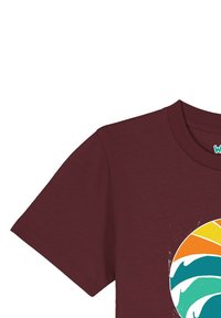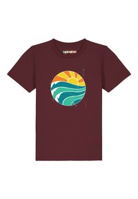 Enfant portant un t-shirt bordeaux avec un graphique coloré de soleil et de vague océanique sur la poitrine.