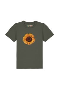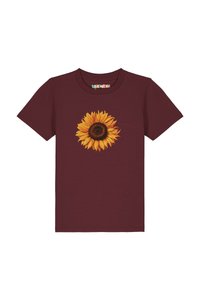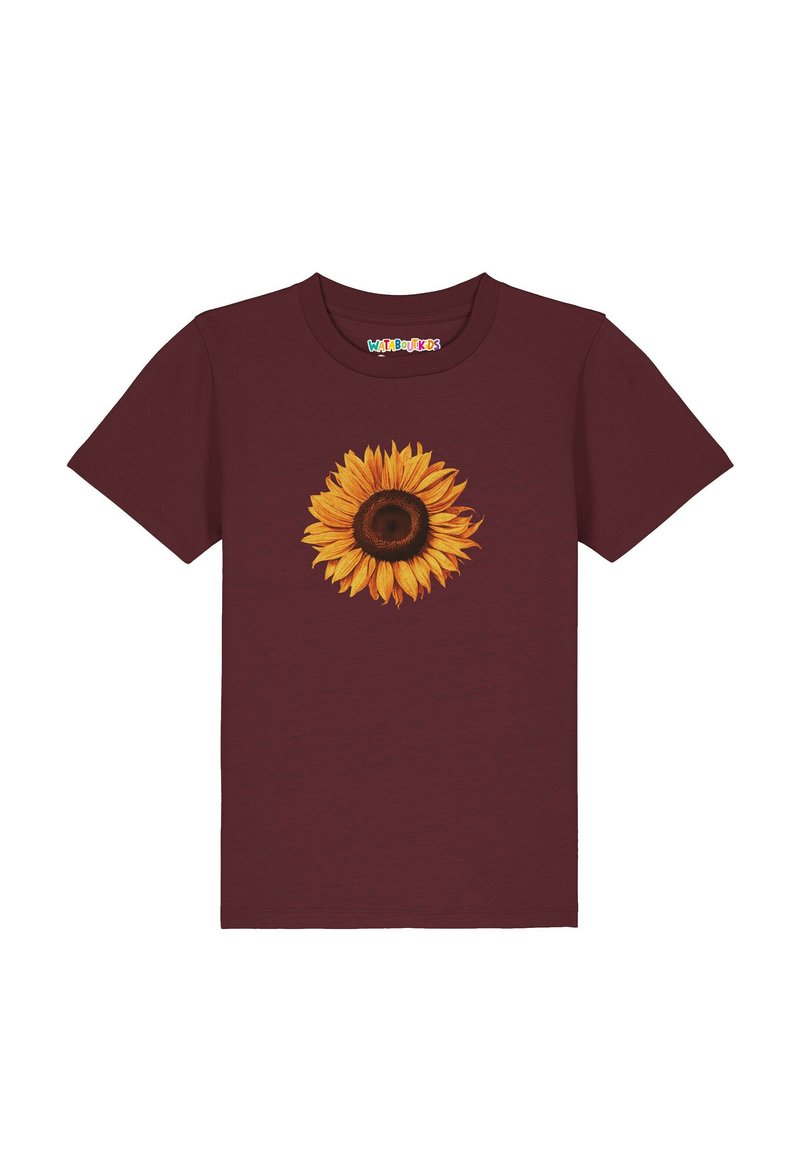 T-shirt marron foncé à manches courtes avec un grand tournesol jaune détaillé imprimé au centre devant.