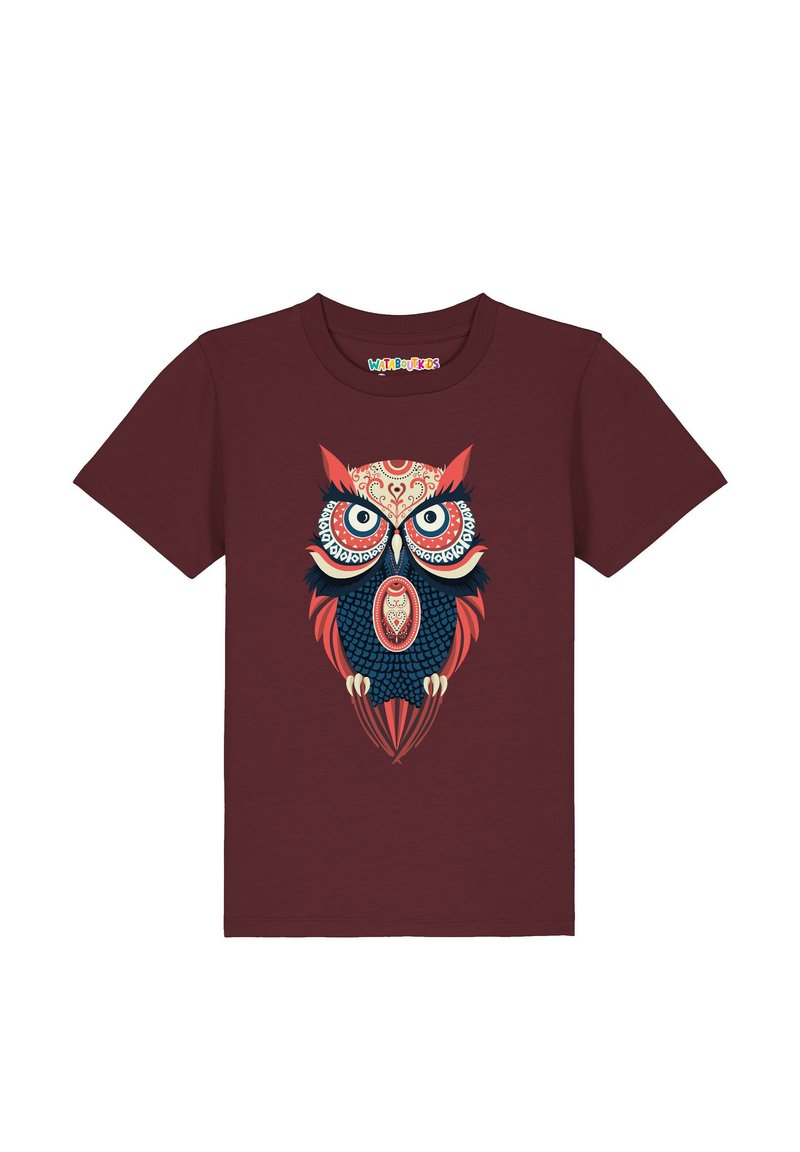 Chemise bordeaux à manches courtes avec un graphique détaillé et coloré d'une chouette présentant des motifs complexes en rouge, bleu, crème et noir sur le devant.