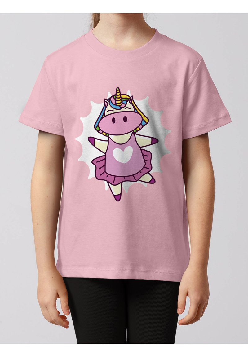Enfant portant un t-shirt rose avec une licorne dansante en tutu violet et un cœur sur la poitrine, debout devant un fond clair.