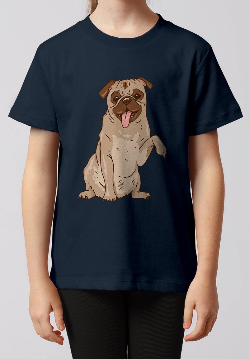 Enfant portant un t-shirt bleu marine arborant un carlin dessin animé assis avec une patte levée et la langue tirée.