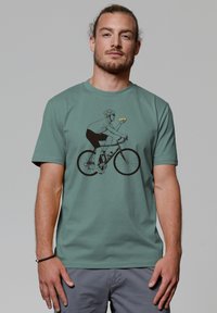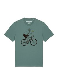 T-shirt vert menthe avec un graphique d'un cycliste tenant une voiture jaune. Manches courtes, en coton, coupe décontractée et design simple.