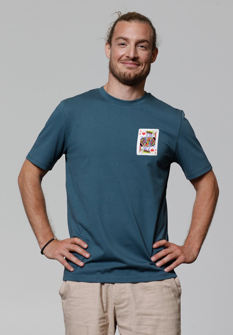 Homme avec barbe et cheveux tirés en arrière, debout les mains sur les hanches, portant une chemise bleu sarcelle ornée d'un motif de carte à jouer Roi de Cœur.