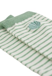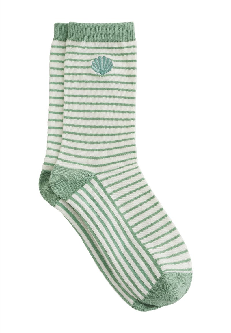 Chaussettes rayées vertes et blanches ornées d'un détail de broderie en forme de coquillage. Tissu doux avec des bords-côtes et une texture lisse. Forme standard de chaussette.