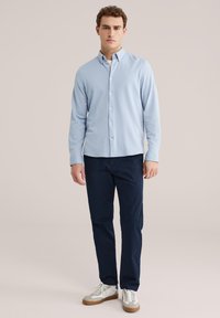 Pantalon chino en coton bleu marine associé à une chemise à boutons bleu clair et des baskets blanches avec des accents gris et des semelles en caoutchouc.