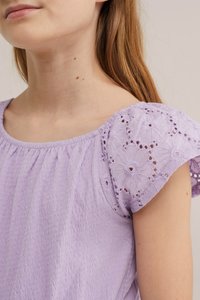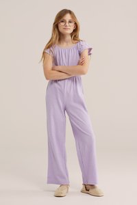 Fille aux longs cheveux clairs portant des lunettes rondes et une combinaison lavande avec des manches courtes en dentelle, debout avec une main sur la hanche.