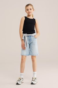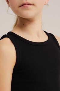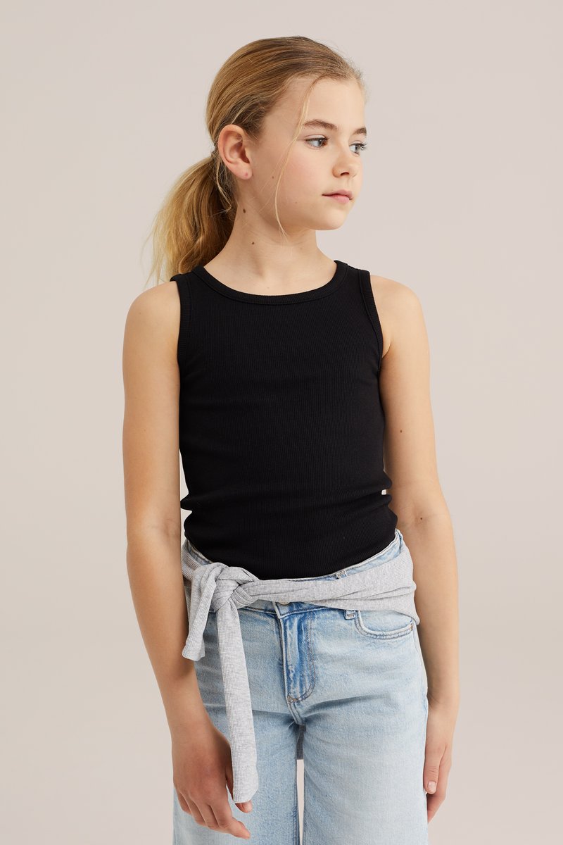 Jeune fille aux cheveux blonds attachés en queue de cheval, portant un haut noir sans manches, un jean bleu clair et un sweat gris noué autour de la taille.
