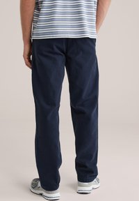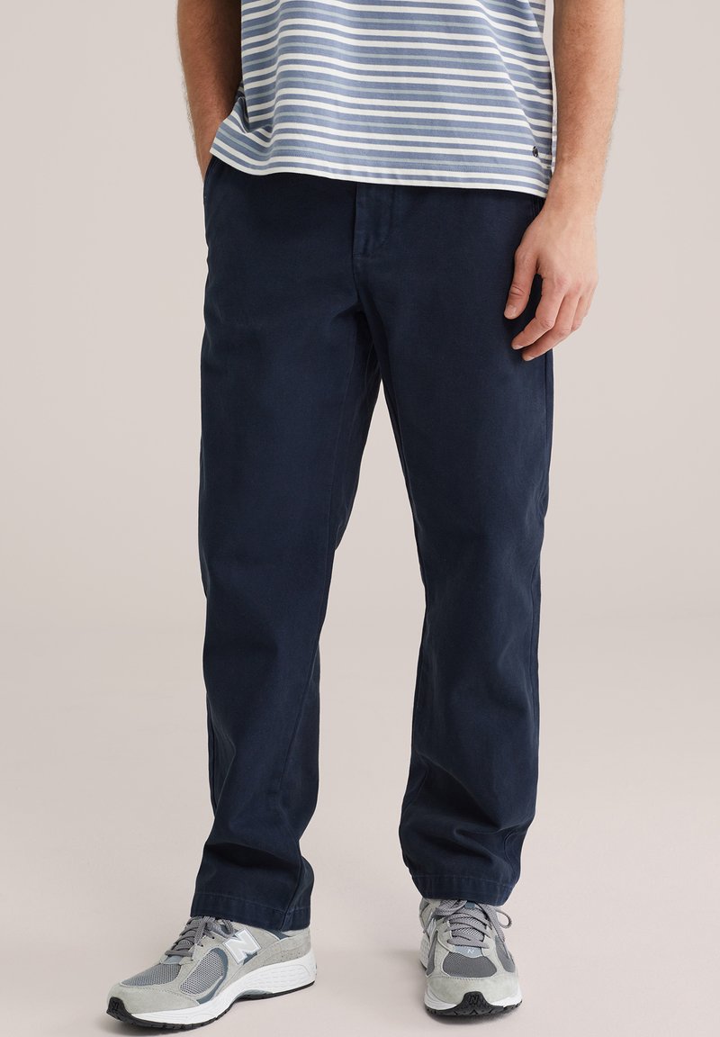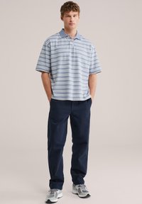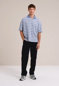 Homme portant un pantalon bleu marine, une chemise à rayures bleu clair et blanc, et des baskets grises, debout les mains détendues.