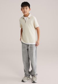 Garçon debout, les mains dans les poches, portant un polo beige, un jean gris clair et des baskets beige sur un fond uni.