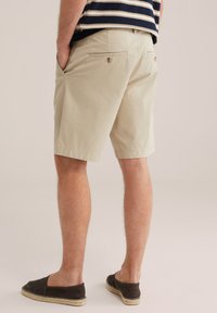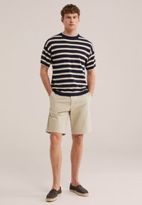 Homme portant un short beige, une chemise rayée et des espadrilles sombres sans lacets, se tenant devant un fond uni.