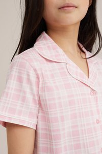 Jeune fille portant un haut de pyjama à manches courtes à boutons à carreaux roses et blancs et un short assorti, debout devant un fond uni.