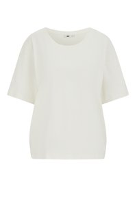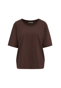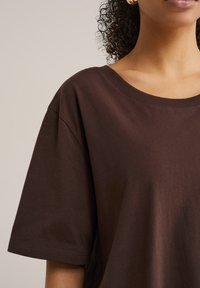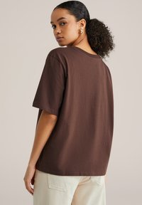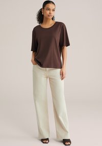 Femme aux cheveux bouclés portant une chemise ample à manches courtes marron foncé et un pantalon beige clair, les mains dans les poches, sur un fond uni.